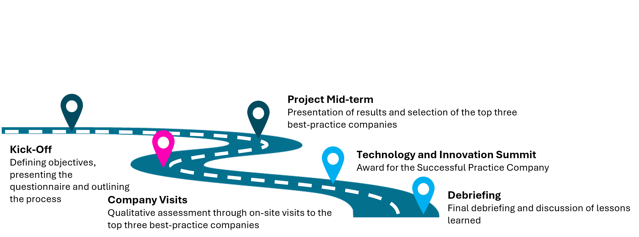 The process begins with a kick-off meeting and the definition of objectives, followed by a survey and an interim evaluation to select the top three entries. This is followed by company visits, the award ceremony at the Technology and Innovation Summit, and a final debriefing.